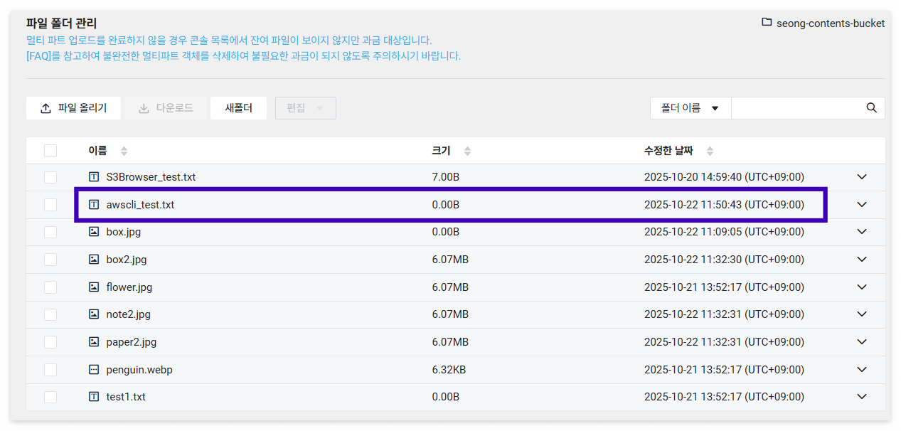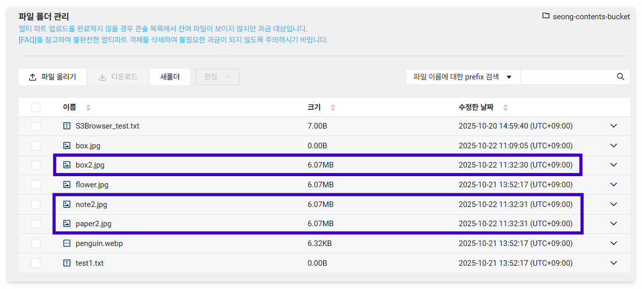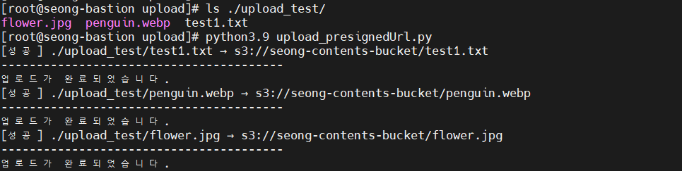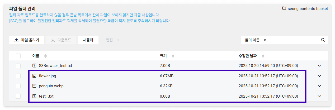 현재 로컬 디렉토리(upload_test)에는 flower.jpg, penguin.webp, test1.txt 3개의 파일이 존재합니다. 해당 디렉토리를 업로드할 디렉토리로 지정하여 Python 코드를 실행한 결과, 대상 버킷(seong-contents-bucket)에 모든 파일이 정상적으로 업로드된 것을 확인할 수 있습니다.