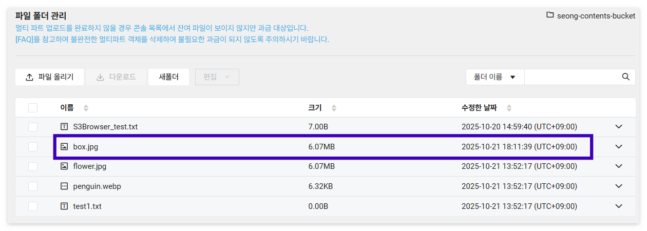 실제로 box.jpg 이미지 파일 한 개를 대상으로 업로드를 요청하였을 때 대상 버킷에 해당 파일이 정상적으로 업로드된 것을 확인할 수 있습니다.