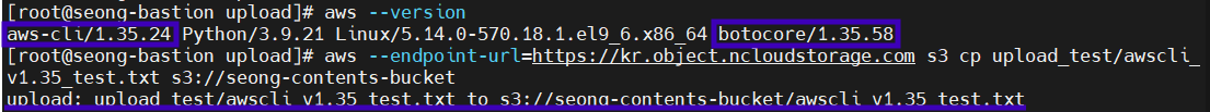 - AWS CLI v1.35 버전에서 업로드 테스트 ▶ 성공