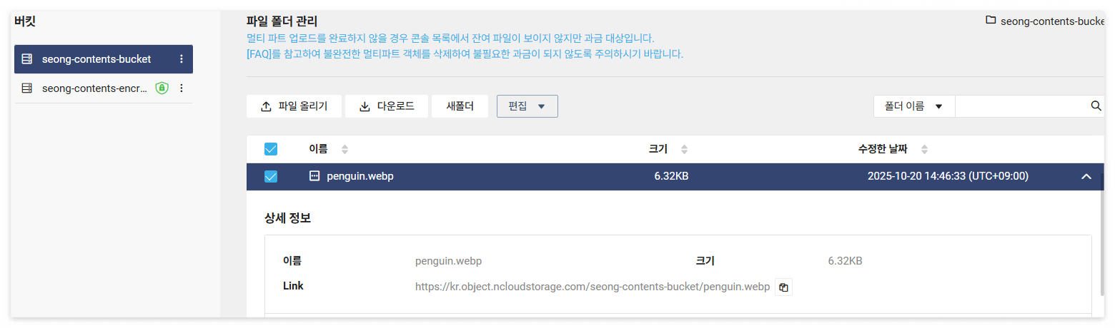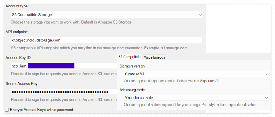 - 메인 계정의 액세스 키를 사용하여 암호화 설정이 적용된 버킷을 대상으로 API를 호출할 경우 권한 관련 오류가 발생할 수 있습니다.