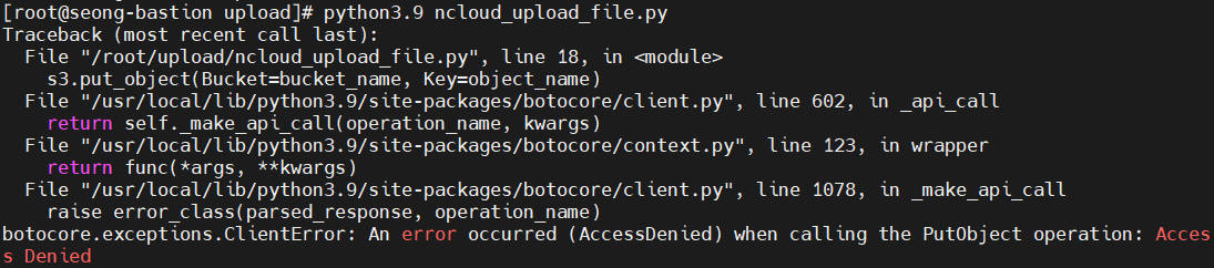 고객사는 SDK(Python boto3)를 이용하여 Object Storage에 업로드를 시도하였으나, 하기와 같은 에러를 띄우며 실패하고 있었습니다.
