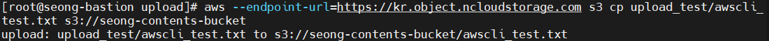 aws --endpoint-url=https://kr.object.ncloudstorage.com s3 cp <local_file_path> s3://<bucket_name>[/<object_name>]