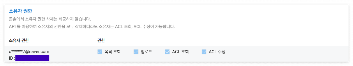 - 목록 조회, 업로드, ACL 조회, ACL 수정 권한 중에 업로드 권한이 있는지 확인합니다.