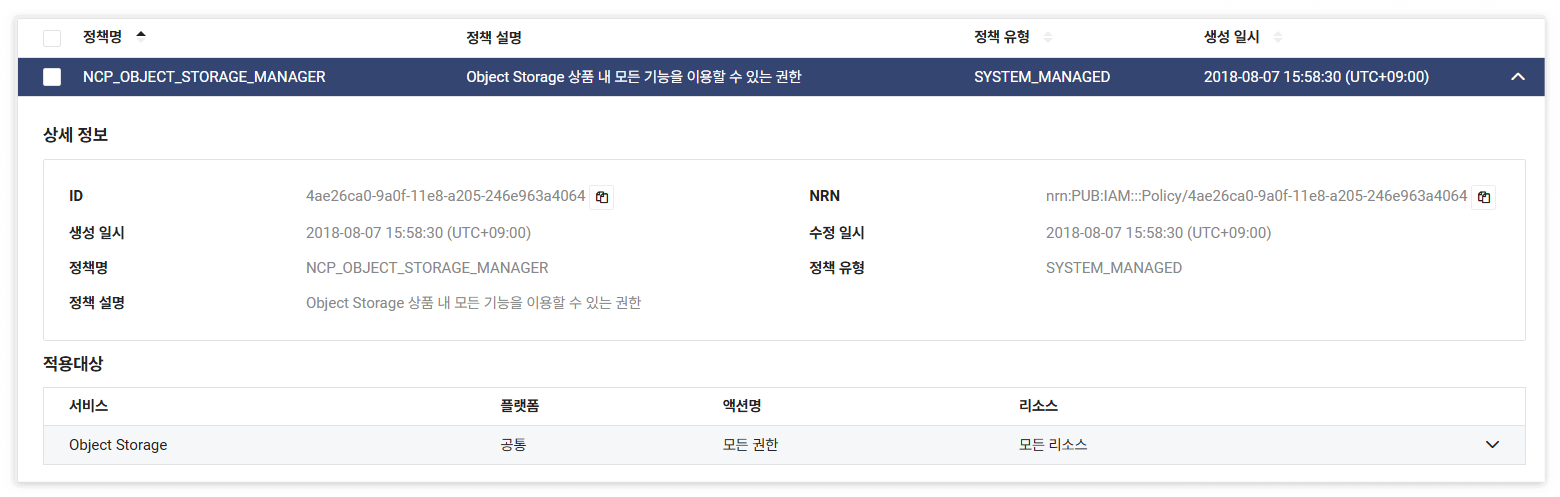 - 서브 계정에 NCP_OBJECT_STORAGE_MANGER 또는 NCP_ADMINISTRATOR 정책이 설정되어 있어야 Object Storage를 이용할 수 있는 권한이 부여됩니다.