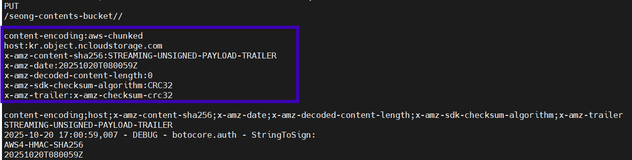 그리고 로그 분석 과정에서 하기와 같이 HTTP 요청 헤더가 포함되어 있음을 발견하였습니다. 이 중 content-encoding:aws-chunked와 x-amz-trailer:x-amz-checksum-crc32 헤더는 S3 표준에서는 허용되지만, 네이버클라우드 Object Storage에서는 지원되지 않을 가능성이 있습니다.