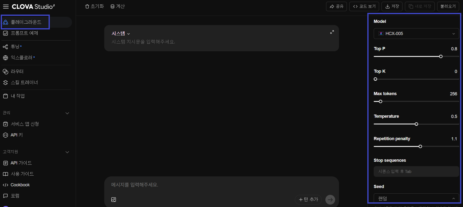 - 플레이그라운드 화면 우측의 파라미터의 기능과 제공 값