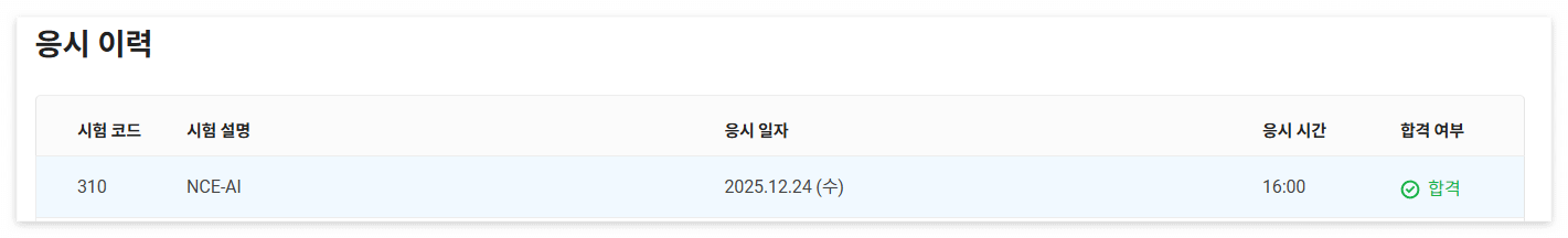 마지막으로 NCE-AI 응시 이력과 취득 내역을 인증하면서 포스팅을 마무리하겠습니다.