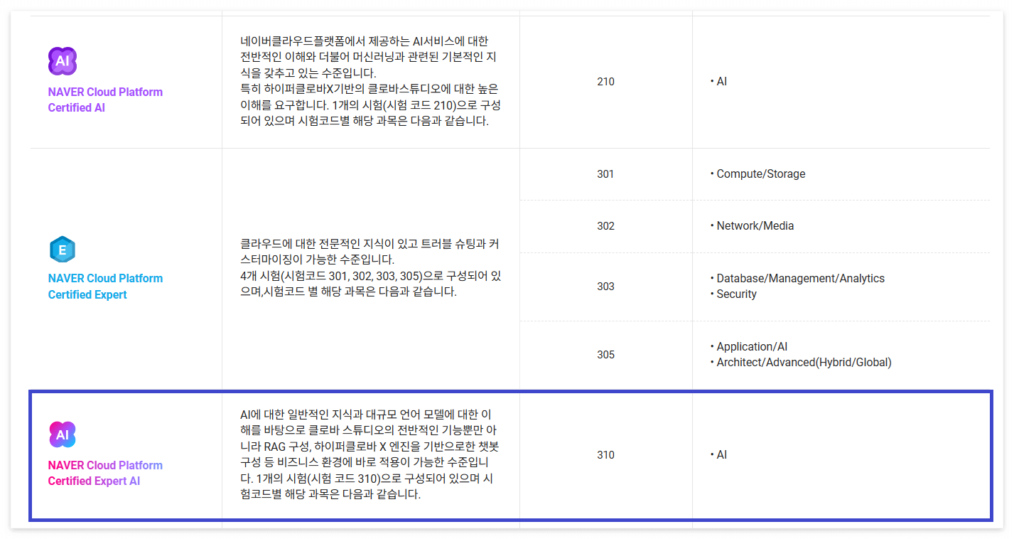 - NCP-AI (210) : NCP에 대한 전문적인 지식이 있고 NCP의 AI 상품에 특화하여 AI 상품을 비즈니스에 적용할 수 있는 수준을 갖추고 있는지를 평가합니다. AiTEMS, CLOVA Chatbot, CLOVA Speech, Papago Tlanslation 등을 포함하여 네이버클라우드에서 제공하는 약 10여 개 이상의 AI 상품군에 대한 전반적인 이해도와 활용 능력을 검증합니다.