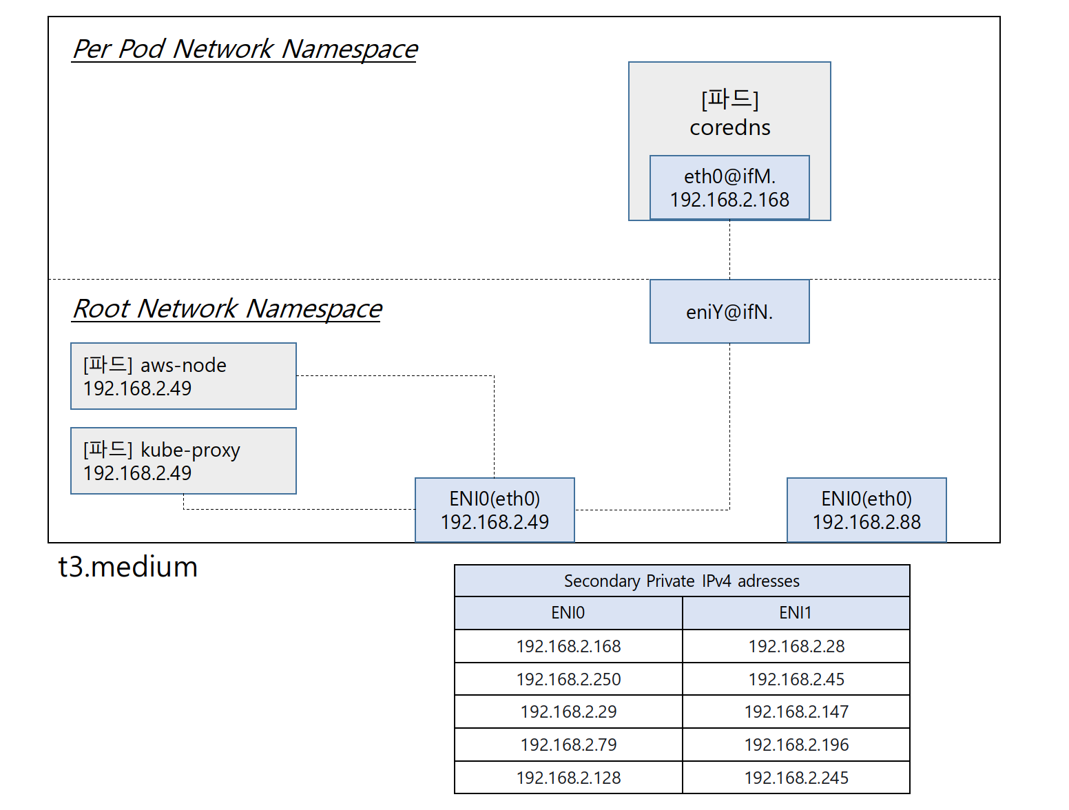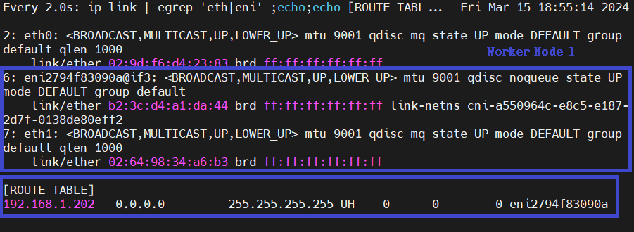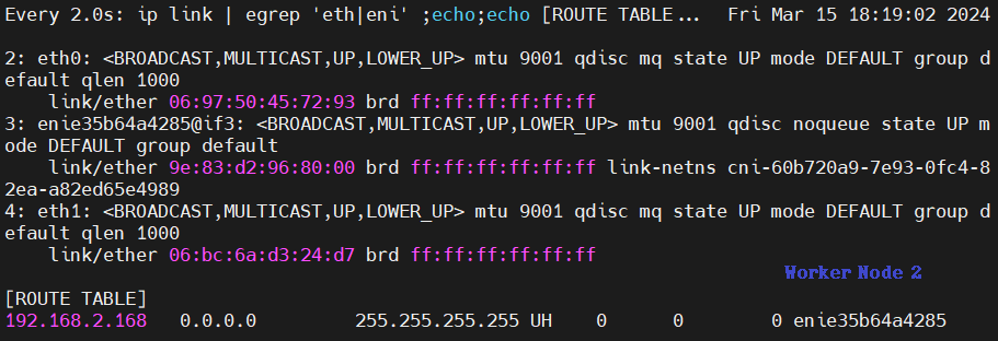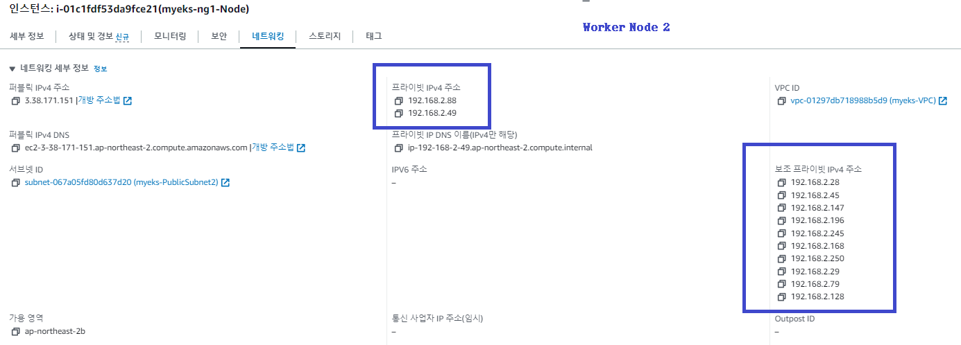 그 외 Worker Node 에서는 구성 변화가 없으나 미리 구성된 IP Pool에서 새 파드에 Secondary Private IP를 할당한 것을 알 수 있습니다.