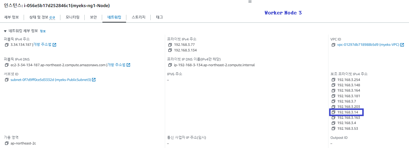 AWS 콘솔에서 Worker Node의 현재 네트워크 구성 정보를 확인합니다.