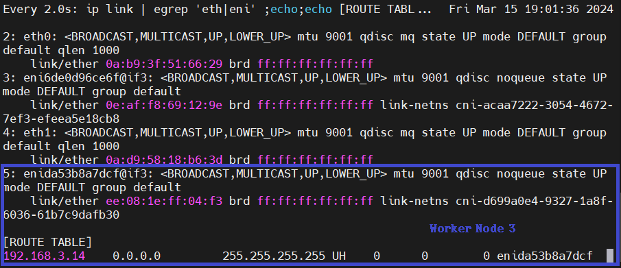 Worker Node 1에 eth1이 추가되었습니다. 또한, 각 Worker Node에서 veth 인터페이스가 하나씩 생성되고 라우팅 테이블에는 새 파드(netshoot-pod)로 향하는 경로가 추가된 것을 확인할 수 있습니다.