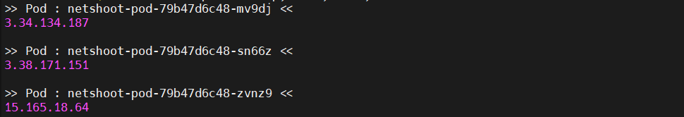파드와 노드에서 각각 외부와 통신하는 공인 IP 주소가 동일함을 확인할 수 있습니다.