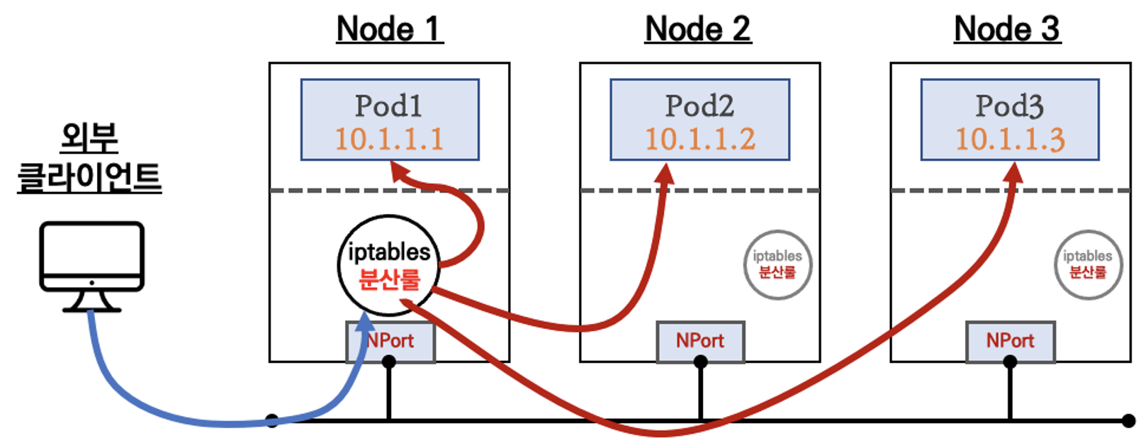 외부 클라이언트가 로드밸런서 접속 시, 로드밸런서 → NodePort → iptables → 파드 → 컨테이너 순으로 전송되며, iptables의 분산룰을 통해 목적지 파드와 통신합니다.
