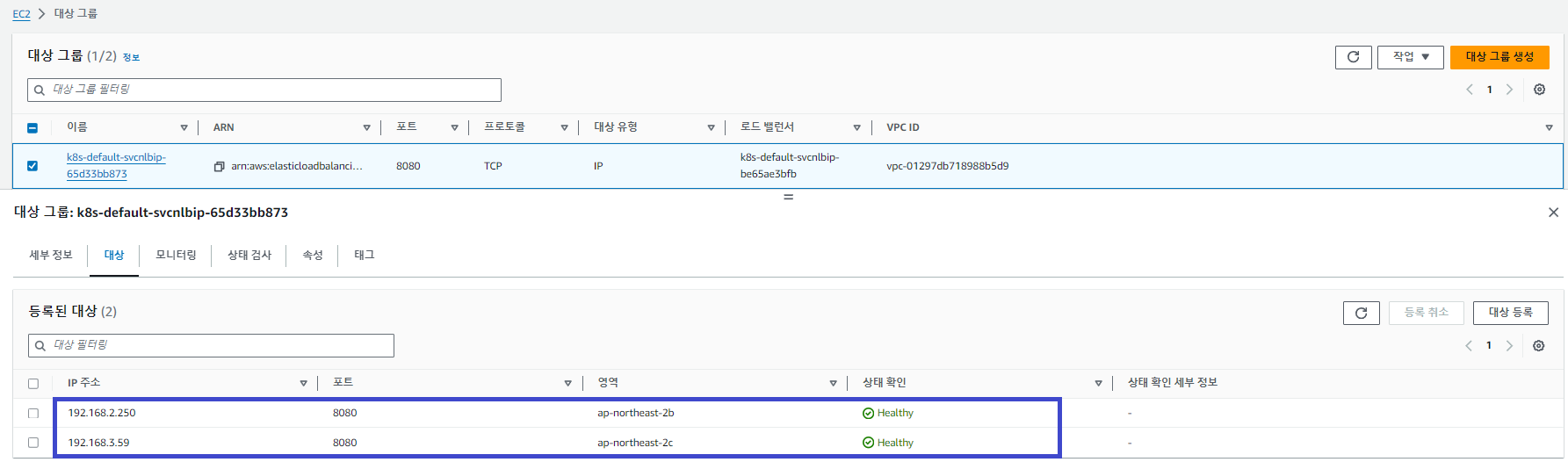 AWS 콘솔에서 80 포트로 리스닝 중인 네트워크 로드밸런서와 8080 포트로 바인딩되는 파드의 상태(healthy)를 확인할 수 있습니다. 또한, LoadBalancer Controller에 의해 파드의 IP(192.168.2.250, 192.168.3.59) 정보가 대시보드에 출력됩니다. 이것이 가능한 이유는 AWS VPC CNI 기반으로 동작하기 때문입니다.