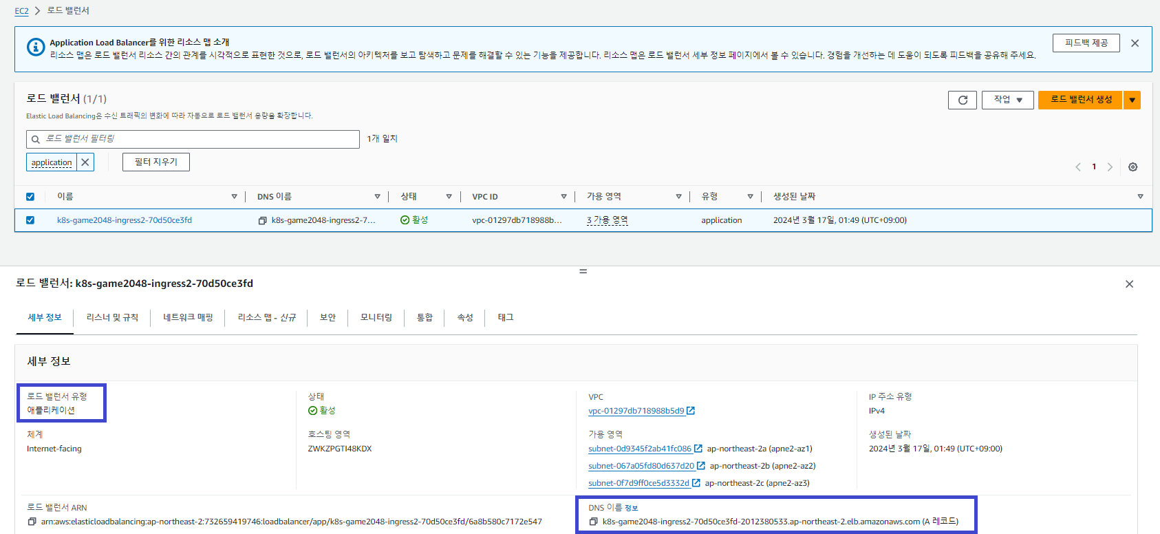 "DNSName": "k8s-game2048-ingress2-70d50ce3fd-2012380533.ap-northeast-2.elb.amazonaws.com",