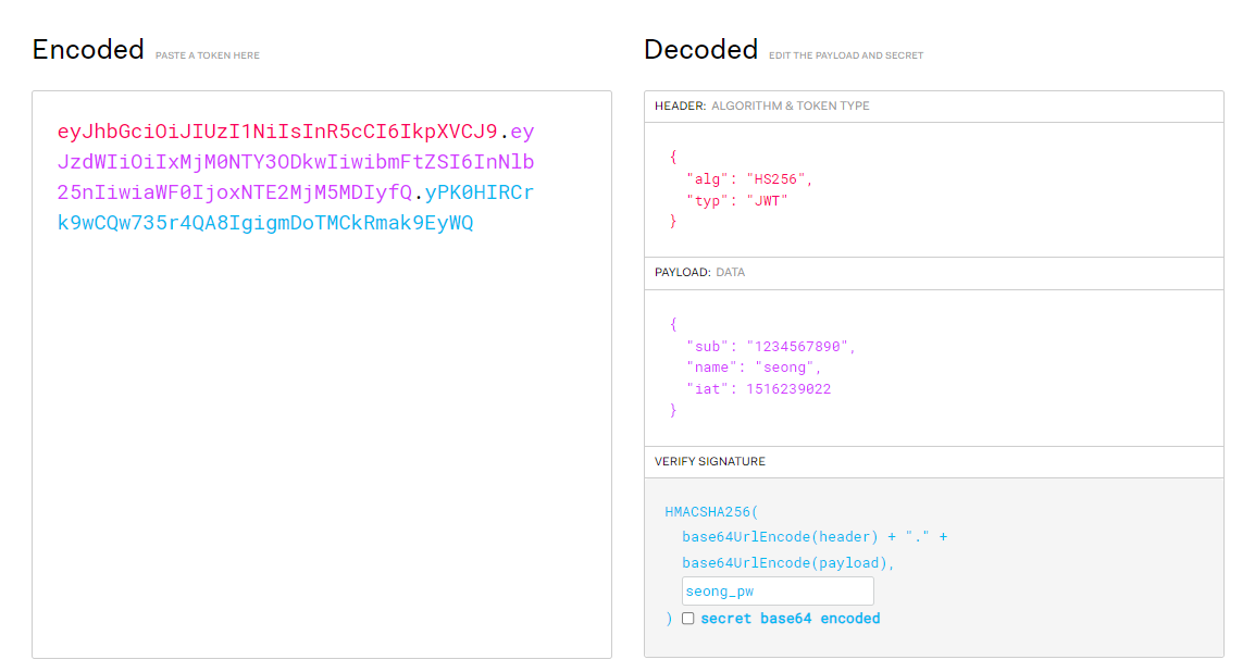 Payload의 "name" claim 값(seong)을 입력하고 비밀키를 적용(seong_pw)하여 JWT를 생성해보겠습니다.