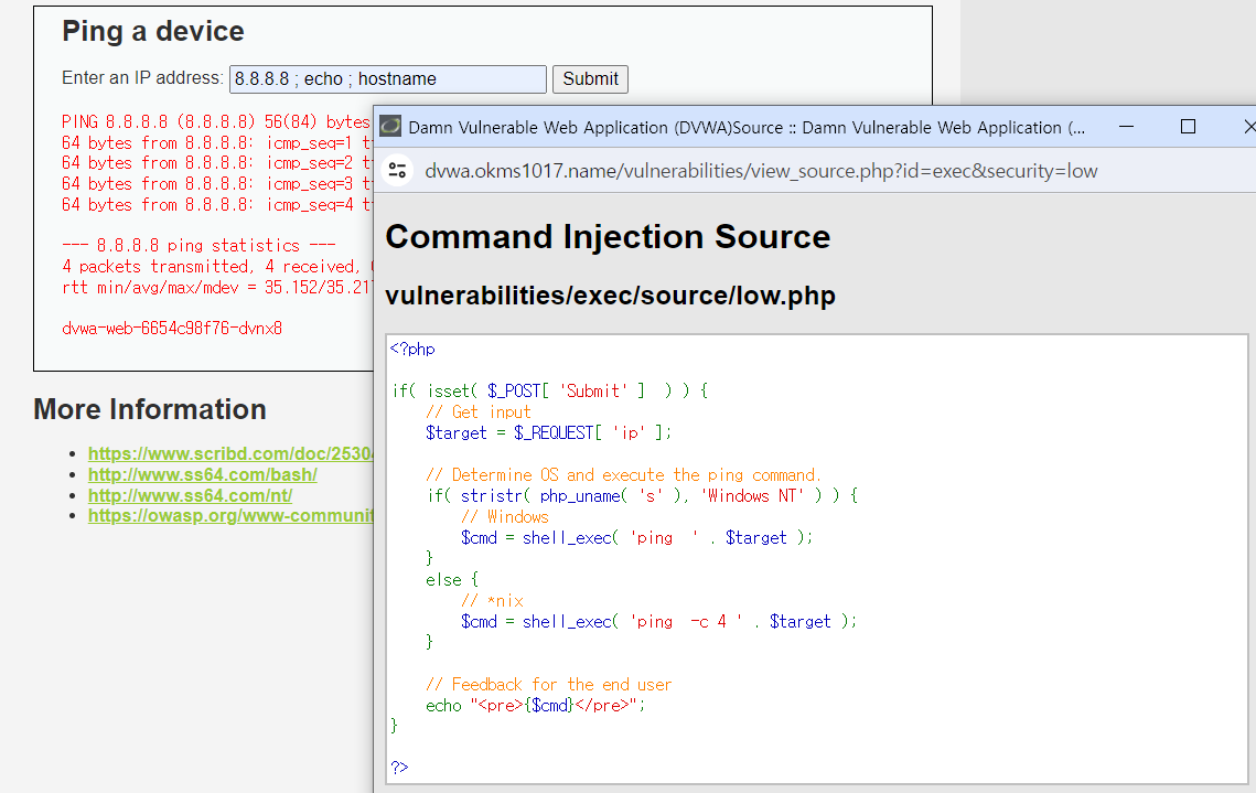Command Injection 공격이 가능한 이유는 Security Level이 낮기(Low) 때문.