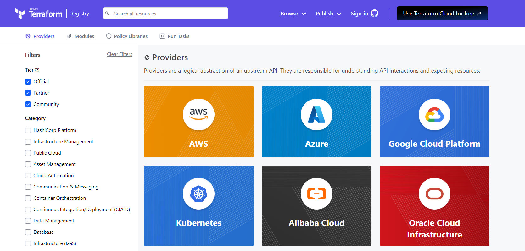 - 테라폼 공식 레지스트리에서 AWS, Azure, GCP, NCloud 등 수천 개 이상의 Provider를 제공하고 있습니다.