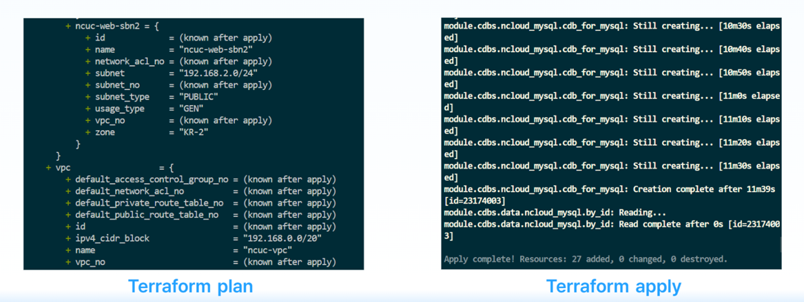 모든 코드를 작성 완료하였으면 하기 명령어를 순서대로 실행하여 리소스를 프로비저닝합니다.