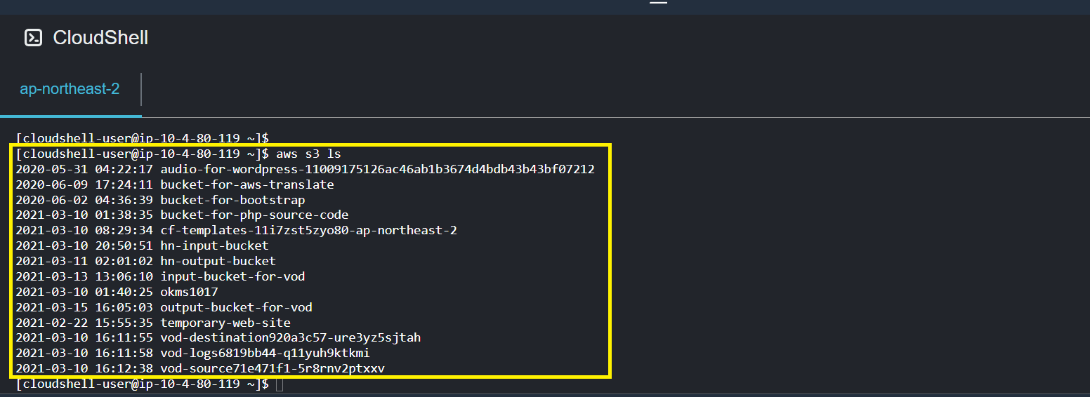 현재 생성되어 있는 S3 버킷 리스트가 조회되는 모습입니다.