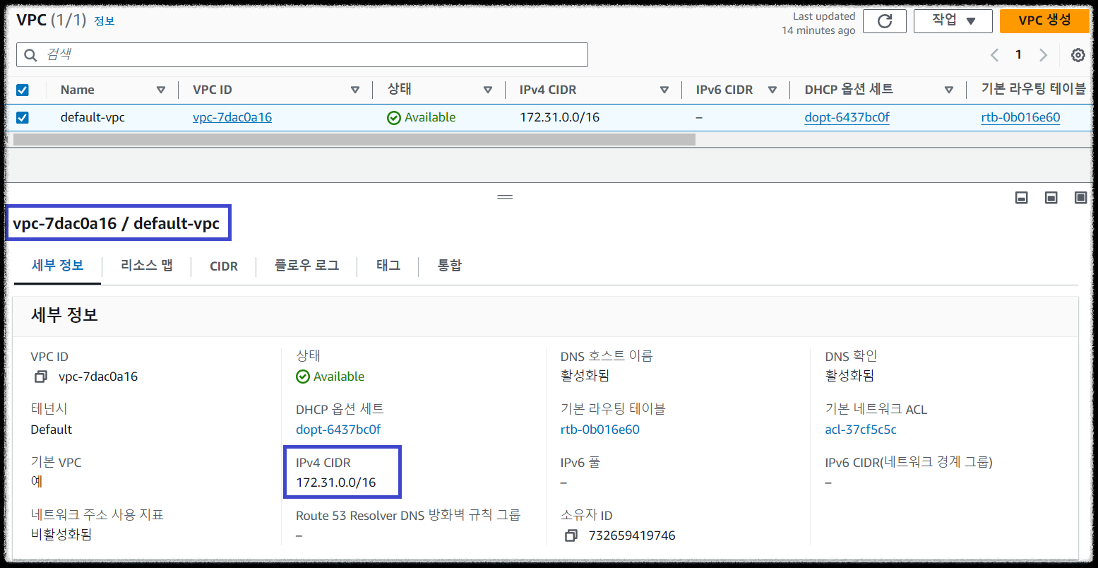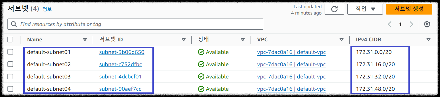 따라서 기본 디폴트 VPC와 Subnet 정보를 사전에 확인합니다.