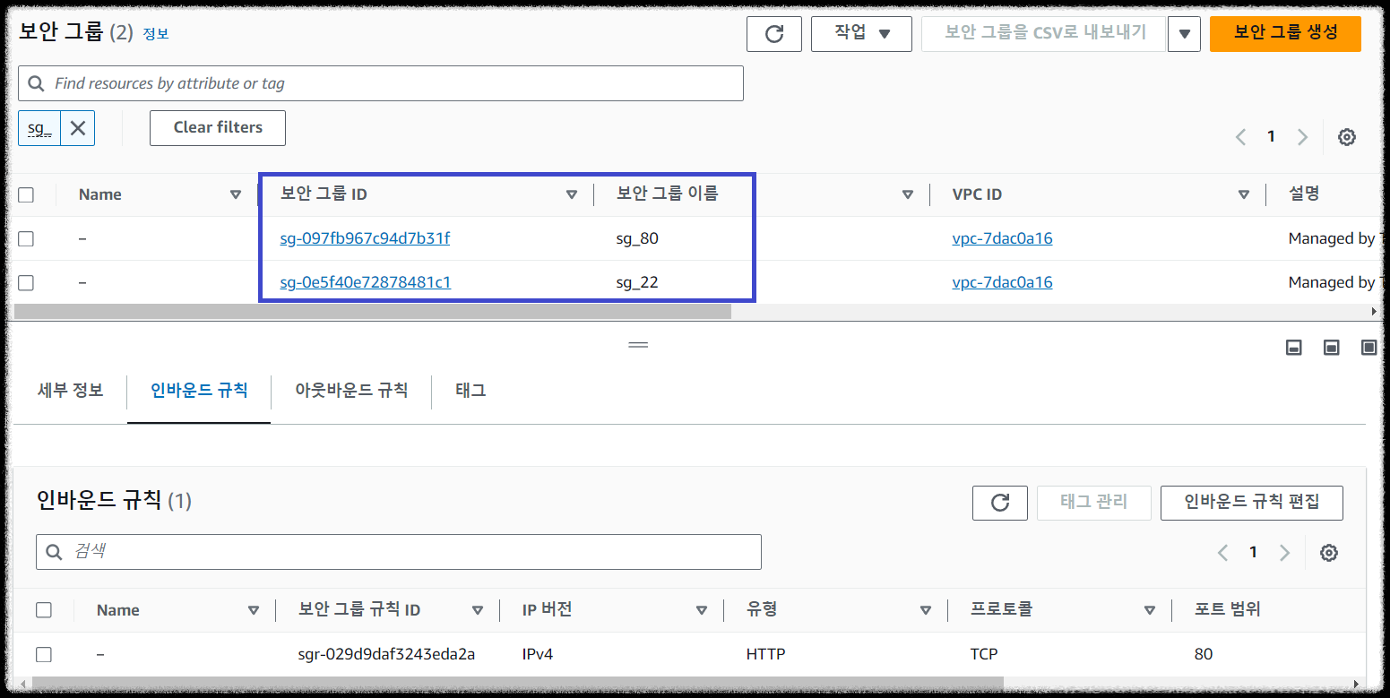 - aws_security_group_rule.sg_80 : 신규 웹 서비스(HTTP)를 위한 80(inbound) 보안 그룹