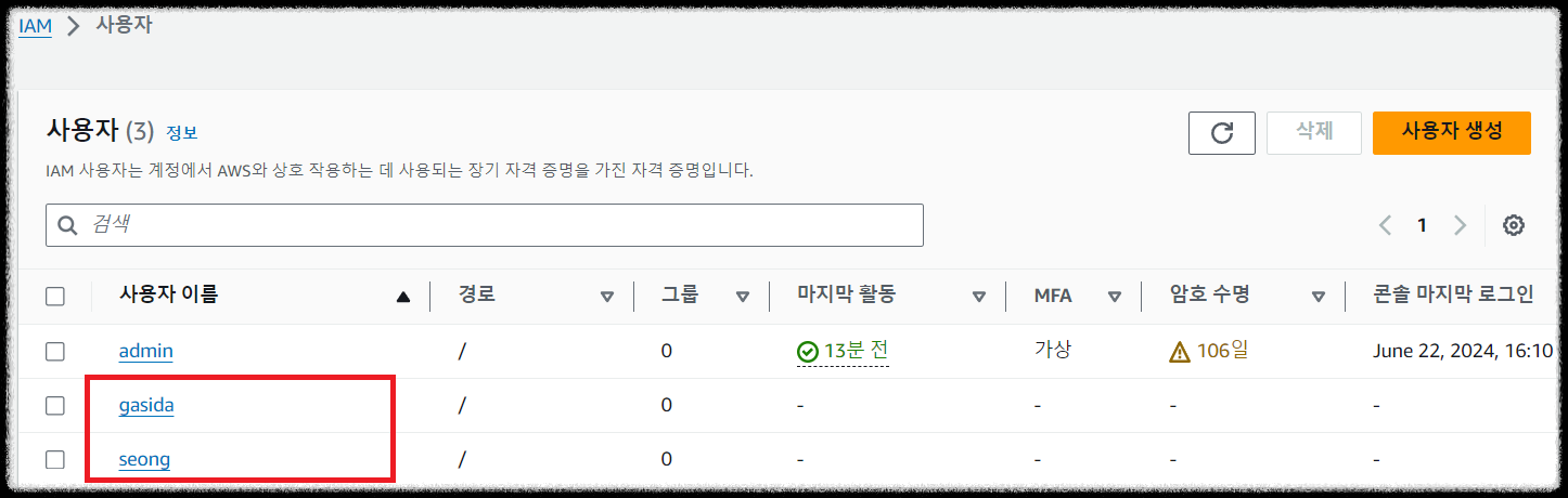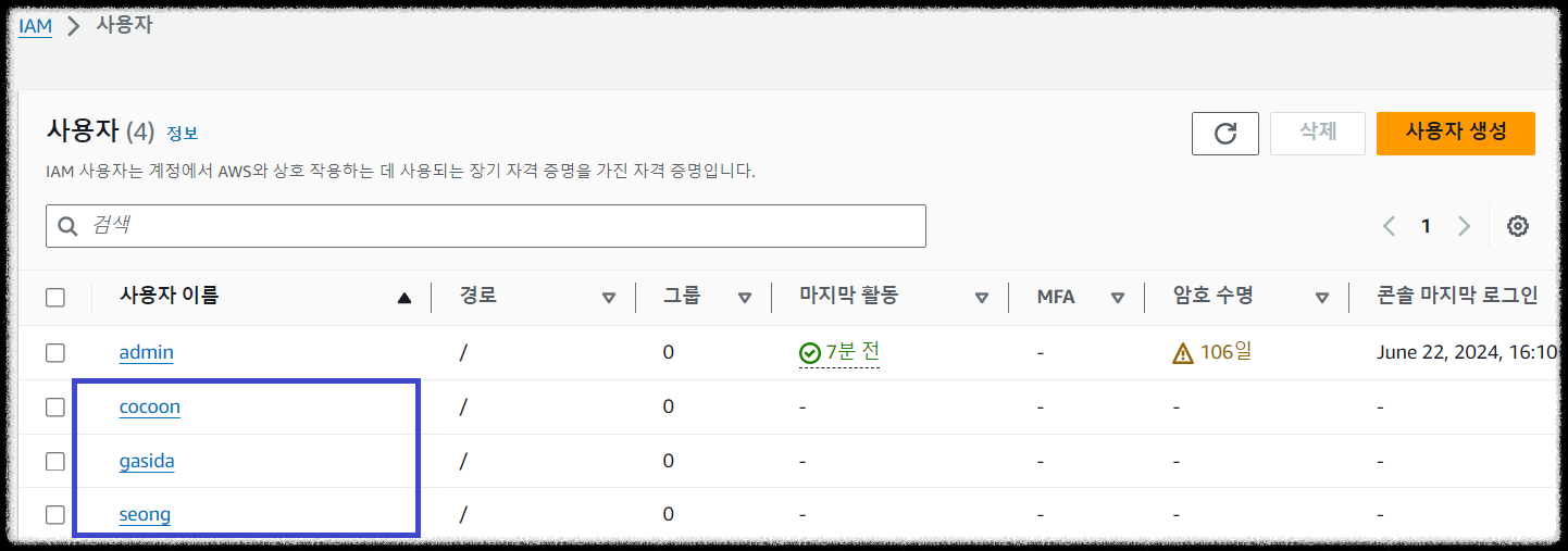 예상하건대 "gasida", "seong", "cocoon" 3개의 IAM User가 생성될 것입니다.