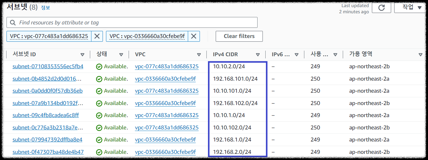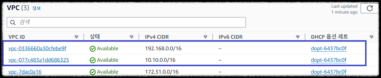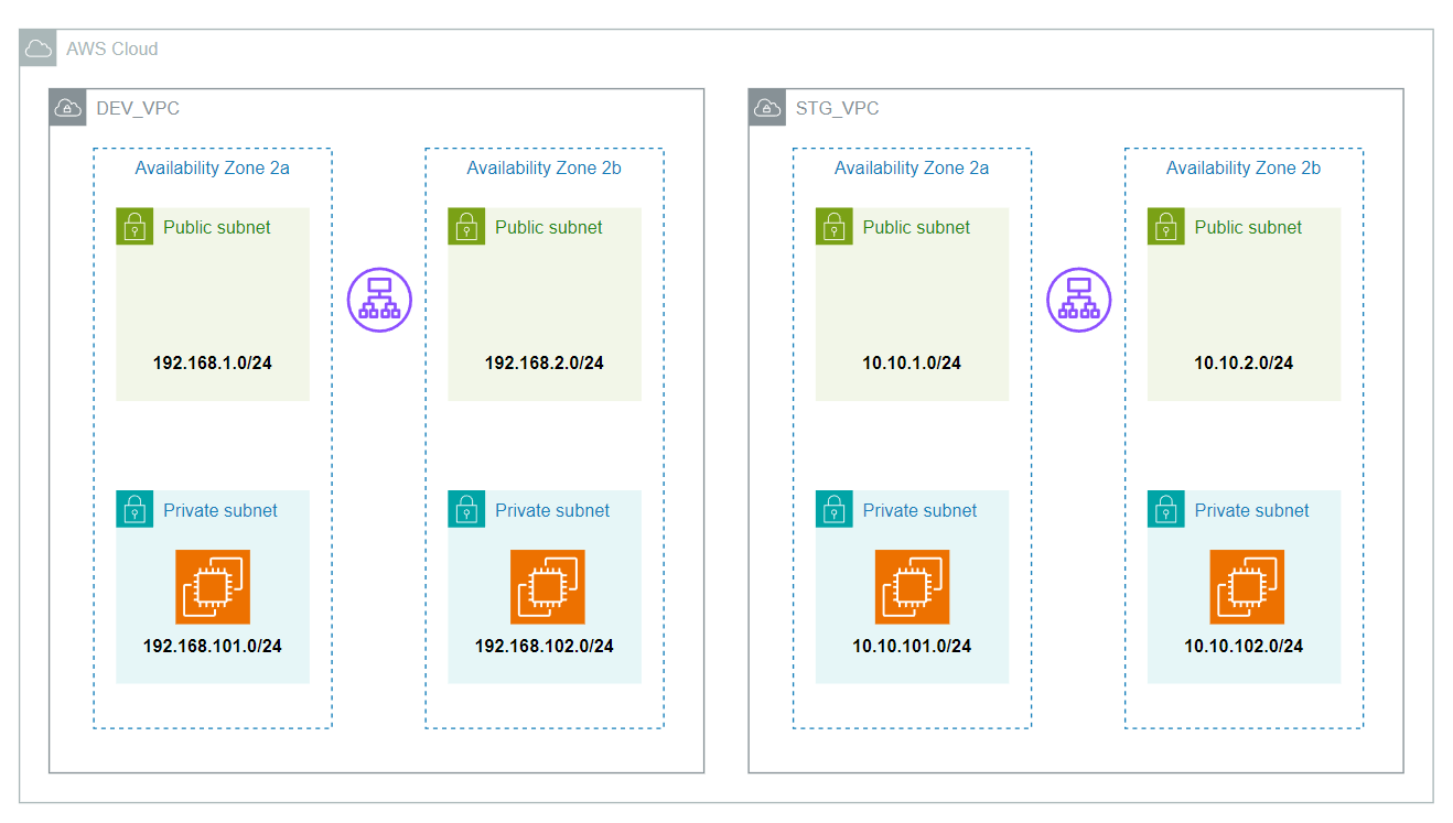 위와 같이 작성하면 개발(dev-vpc, 192.168.0.0/16) 및 스테이징(stg-vpc, 10.10.0.0/16) 2개의 VPC를 구성하고,