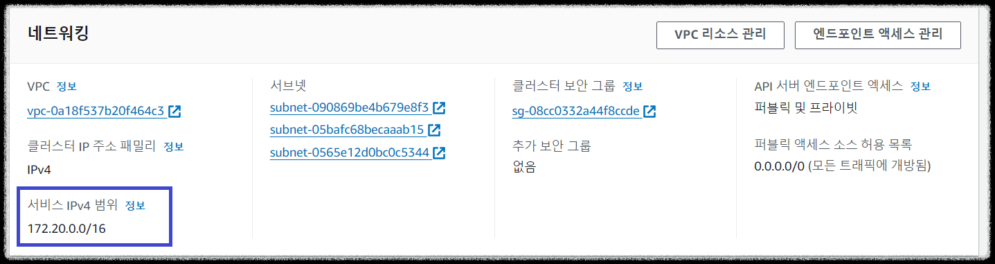 kubernetes_network_config는 EKS 클러스터 내에서 통신을 가능하게 하는 설정으로 해당 네트워크 대역(172.20.0.0/16)을 사용할 것임을 명시합니다.