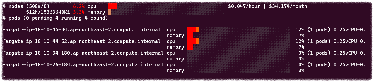 컴퓨팅 노드는 Fargate 인스턴스 유형으로 총 4개가 배포된 것을 확인할 수 있습니다.