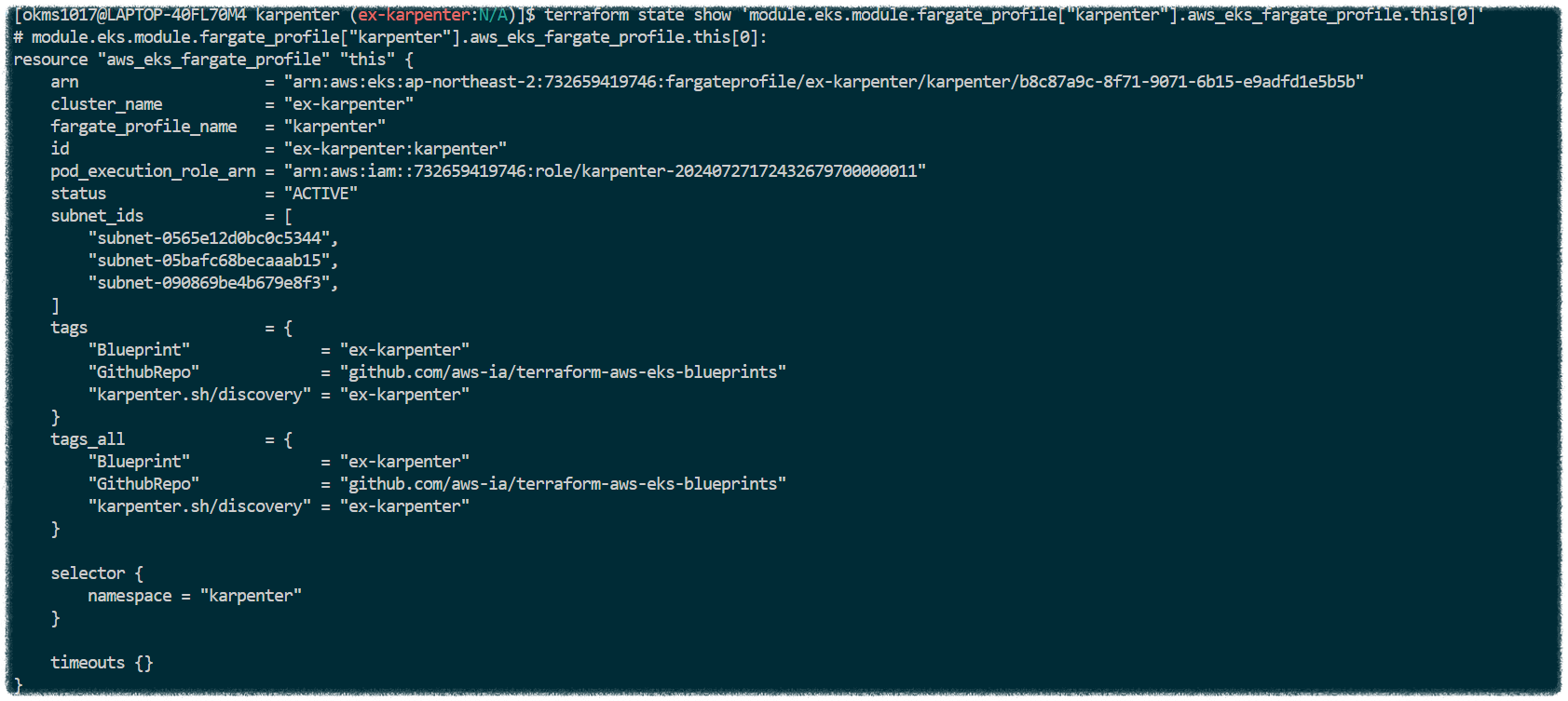 위와 같이 EKS 클러스터 모듈 내에 Fargate Profile을 명시함으로써 'karpenter'와 'kube-system' 네임스페이스에 지정한 파드가 각각 배포되도록 합니다.
