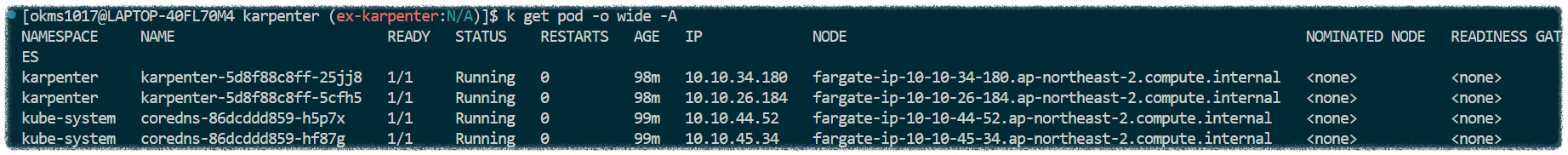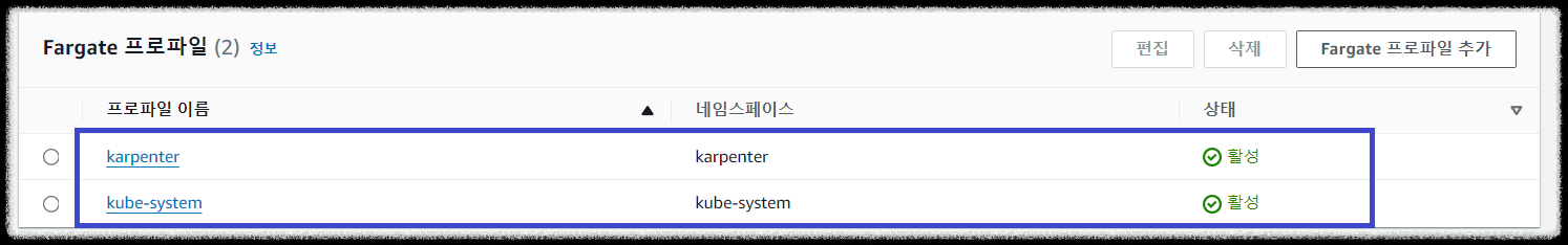 Fargate는 파드 하나당 노드 하나가 할당됩니다. 결국 'karpenter'와 'kube-system' 파드가 Fargate 유형의 인스턴스로 하나씩 배포된 것을 알 수 있습니다.