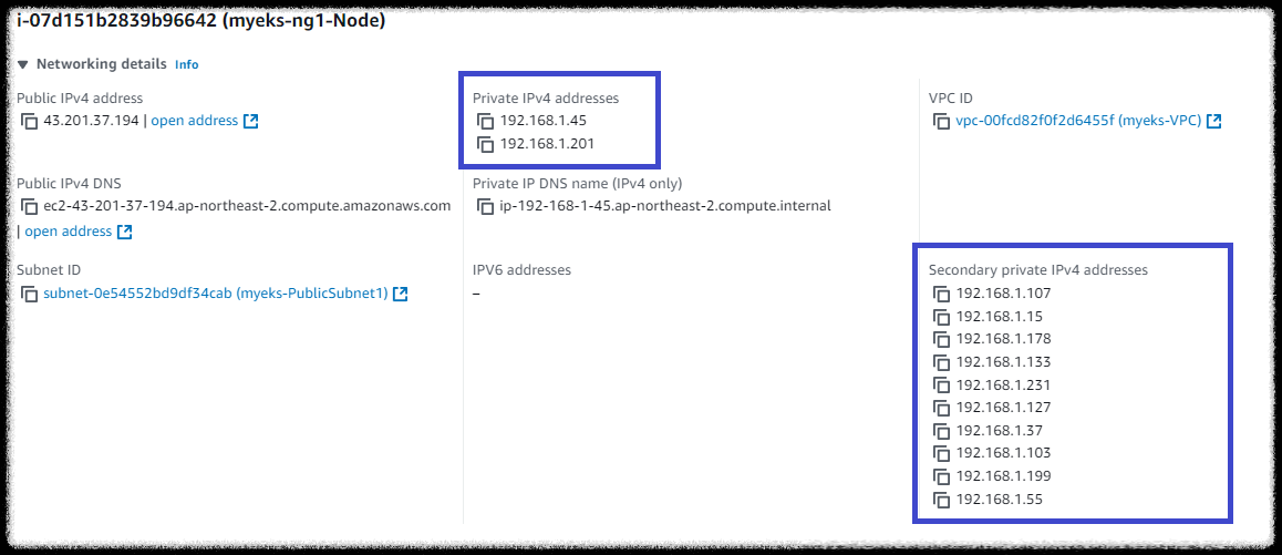 워커노드의 네트워크 인터페이스(ENI)는 Primary IP와 Secondary IP로 나뉩니다. 아래와 같이 1번 워커노드는 2개의 Primary IP와 10개의 Secondary IP를 가지고 있습니다. Primary IP는 ENI의 IP 주소를 의미하고, Secondary IP가 미리 할당된 Warm IP Pool 입니다. 즉, 새로운 파드가 배포될 때 해당 IP Pool에서 주소가 할당되는 것입니다.