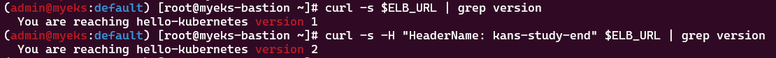 가용 영역(ap-northeast-2a)에 위치한 어플리케이션 파드(deploy-echo-859cc9b57d-wcf6t)를 삭제하여 테스트를 진행합니다. 결과는 다른 가용 영역(ap-northeast-2b)에 위치한 어플리케이션 파드(deploy-echo-859cc9b57d-wlckw)로 요청이 전송됩니다.