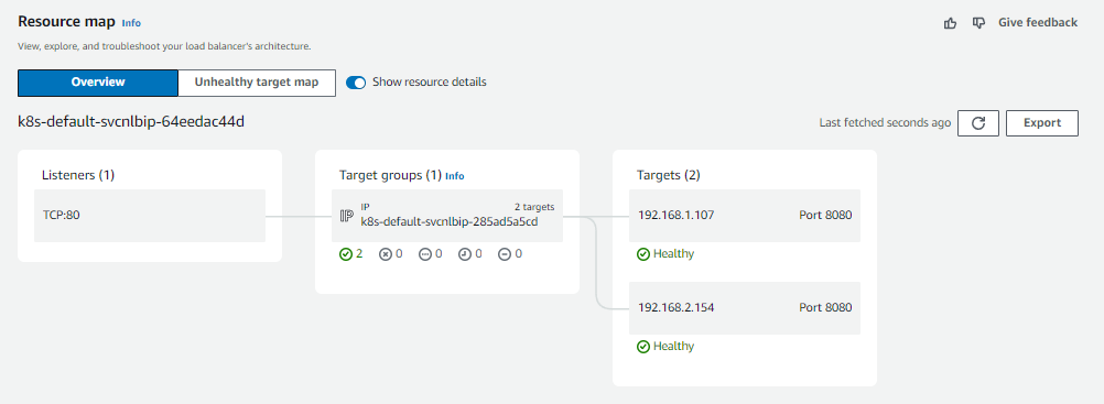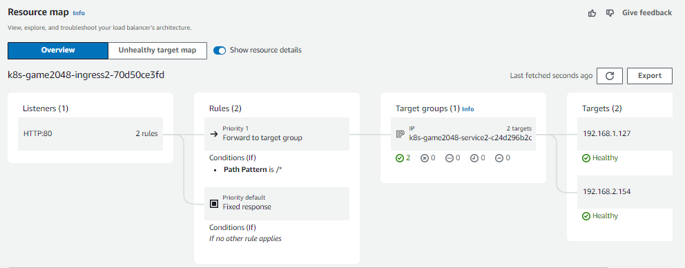 ALB를 배포하고 타겟그룹과 리소스맵을 확인합니다. NLB와 거의 마찬가지로 파드의 IP 주소로 직접 통신하며, 한 가지 다른 점은 URL 기반의 규칙이 존재한다는 점입니다.