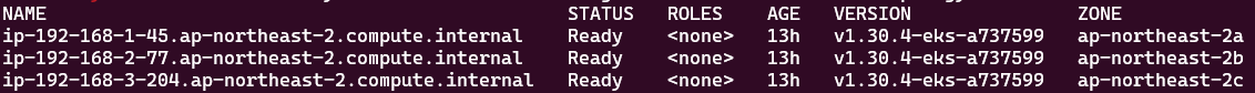 현재 클러스터 노드는 서로 다른 가용 영역(2a,2b,2c)에 분산 배치되어 있습니다. 클라이언트 파드에서 서비스로 요청을 보내면 각 노드의 어플리케이션 파드로 요청이 분산됩니다.