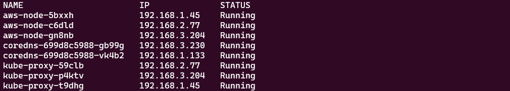 VPC CNI는 aws-node 명칭의 데몬셋으로 배포됩니다. aws-node-* 파드는 2개의 컨테이너로 구성되어 있습니다. 첫 번째 컨테이너는 CNI 네트워크를 구축하고, 두 번째 컨테이너는 eBPF 기반의 NetworkPolicy를 처리합니다. 각각 amazon-k8s-cni:v1.18.6-eksbuild.1와 amazon/aws-network-policy-agent:v1.1.3-eksbuild.1 이미지를 가져와 실행합니다. 그리고 aws-node와 kube-proxy 파드는 호스트 네트워크를 그대로 사용하며, 어플리케이션 파드는 호스트 네트워크와 동일한 대역을 사용하게 됩니다. coredns 파드 또한 호스트 네트워크와 동일한 대역의 IP 주소를 할당받은 것을 확인할 수 있습니다.