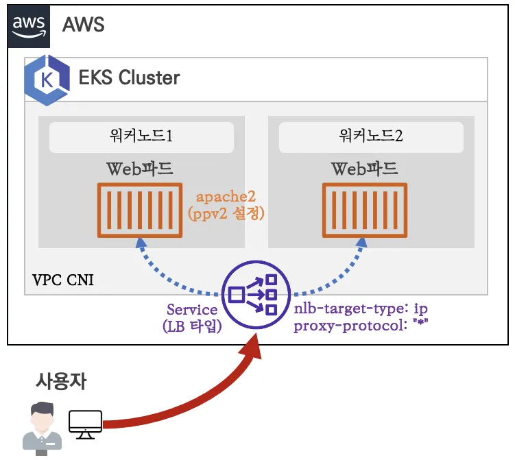 NLB를 사용하는 경우 외부 클라이언트의 IP 주소를 바로 확인할 수 없습니다. 이 때, PPv2(Proxy Protocol v2)를 활성화하면 L7 단의 IP Header를 인식할 수 있습니다. 단, NLB 뿐만 아니라 대상 어플리케이션(Apache, Nginx, HA Proxy 등)에서도 PPv2 옵션을 활성화해주어야 합니다.