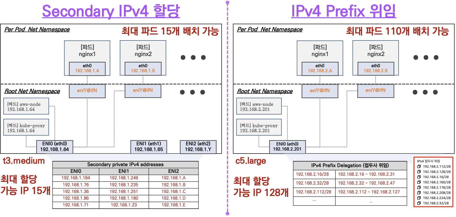 그러나 파드가 ENI에 종속되므로 15개를 초과한 나머지 파드는 배포되지 못하는 제약사항이 있습니다. 이를 해결하기 위해 IPv4 Prefix Delegation 방식을 사용하여 파드 수 제한을 늘릴 수 있습니다. IPv4 Prefix Delegation이란 IP 대신 서브넷을 위임하는 방식입니다.
